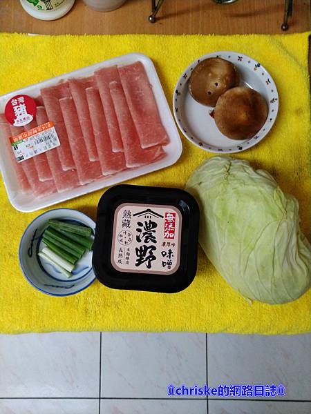 材料:濃野味噌、豬肉片、香菇、高麗菜、蔥