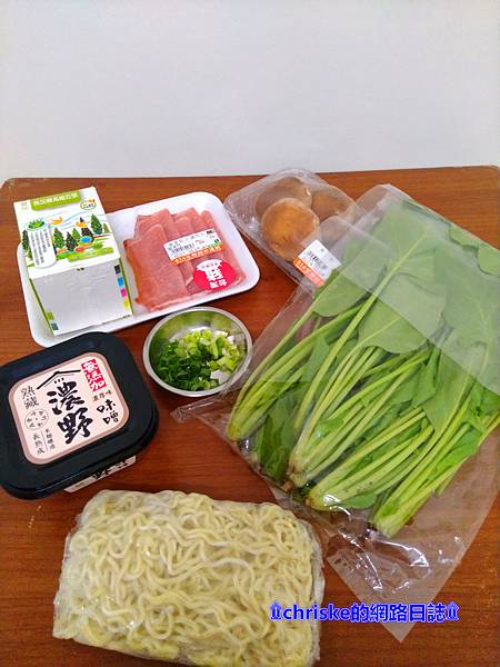 材料:濃野味噌、拉麵、無糖豆漿、喜歡的蔬菜、豬肉片、蔥
