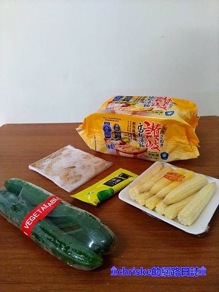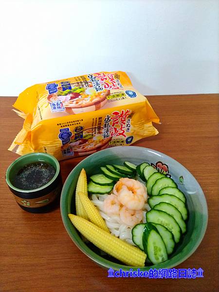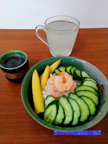 材料:蝦仁、檸檬原汁冰磚、玉米筍、小黃瓜、讚岐烏龍湯麵(鰹魚風味醬汁)