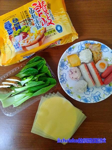 材料:綜合火鍋料、青江菜、香菇、豆紙、讚岐烏龍湯麵(鰹魚風味醬汁)