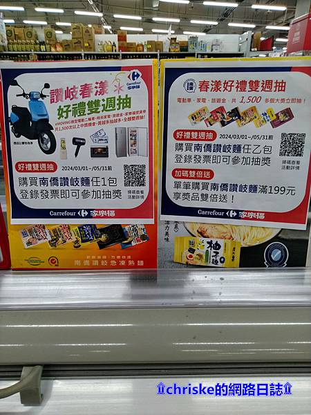 在賣場還有看到現在買南僑讚岐麵有登錄發票參加扌由獎的活動喔~最大獎是微型電動二輪車🛵